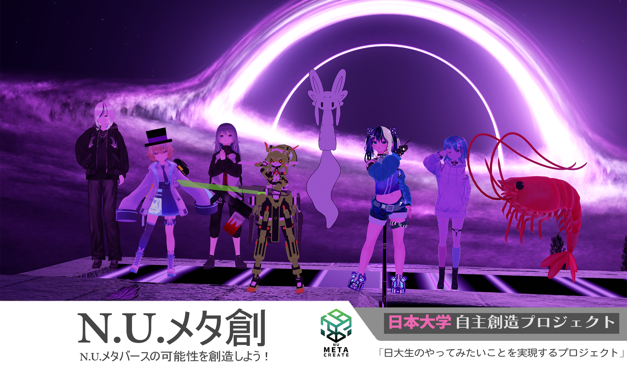 メタ創 - 日本大学 学部横断メタバース・デジタル創作コミュニティ 『N.U.メタバースの可能性を創造しよう!』(略:メタ創)は、日本大学の理工学部・工学部・芸術学部の学部生で構成される、 2025 年 4 月に発足した、顧問を置かず学生だけで自由に創作活動を行う、大学本部直轄のプロジェクト団体です! プロジェクトというのは、『日大生のやってみたいを実現するプロジェクト』という制度を用いた学生団体のことです。 文化の発展 or 日本大学の発展 or SDGs いずれかに寄与するやってみたいことを日本大学から 1 年間手厚いご支援をしていただけるという制度となっており、毎年 20 ~ 40 団体がこちらの制度を活用して日本大学から学生団体が立ち上がっています。 メンバー構成 理工学部(千葉県・船橋キャンパス):5 名 芸術学部(東京都・練馬キャンパス):3 名 工学部(福島県・郡山キャンパス):2 名 合計:10 名 活動場所 メンバーが全国に散らばっているため、活動の中心は Discord で行っています。 Discord:企画、ミーティング、制作進行 VRChat:ワールド制作、動作確認 イベント会場:展示など オンラインを活用し、場所に縛られず柔軟に活動しています。 Discord 今年度の主な活動 今年度は、0 からの学生団体の立ち上げや、ゲームワールド制作、外部イベントへの参加・発表・展示を行いました! 0 からのメンバー集め Discord サーバー等の創作環境の充実化 ホームページ制作 日本大学公認化 4次元空間を彷徨える VRChat ゲームワールドの制作 多数の動画を制作 IVRC メタバース部門での発表と出展(受賞) Vket2025Winter での出展 少人数メンバーで、VketReal や XR Kaigi、ハッカソン、その他技術系イベントに参加 NUMA 経由での他大学のメタバースサークルとの交流 超異分野学での出展 イベント出展の様子 IVRC現地展示 ...